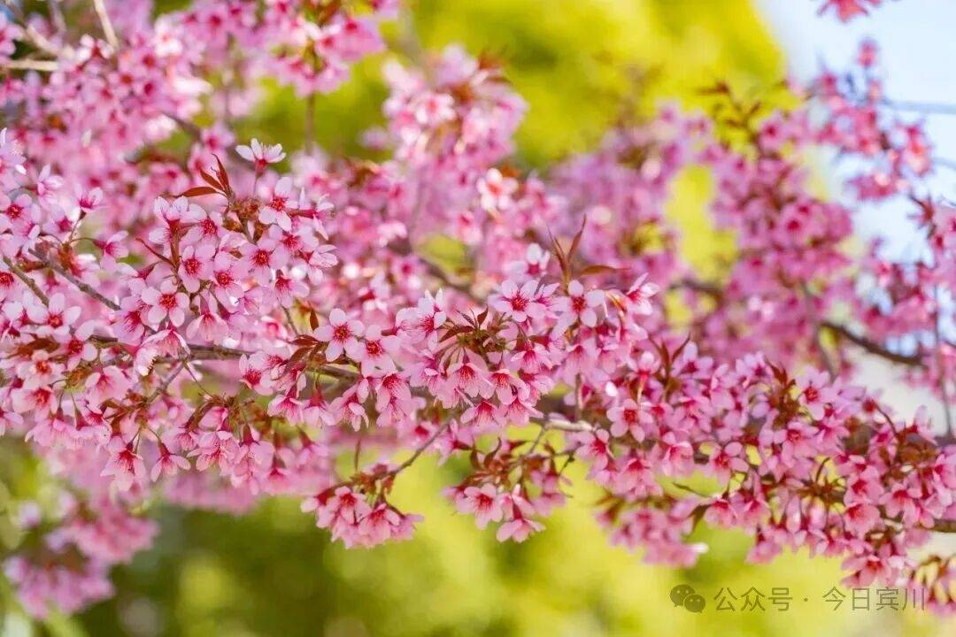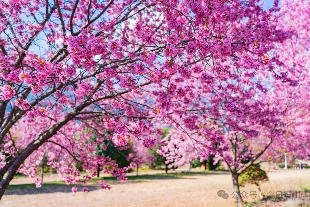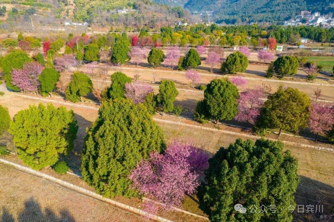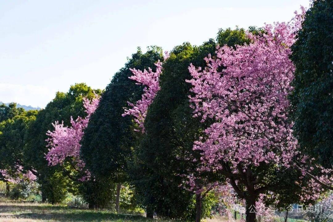 蓝天如洗,白云轻飘,粉嫩花海与苍劲的香樟、柏树相互交织,勾勒出冬日里最明媚的画卷。